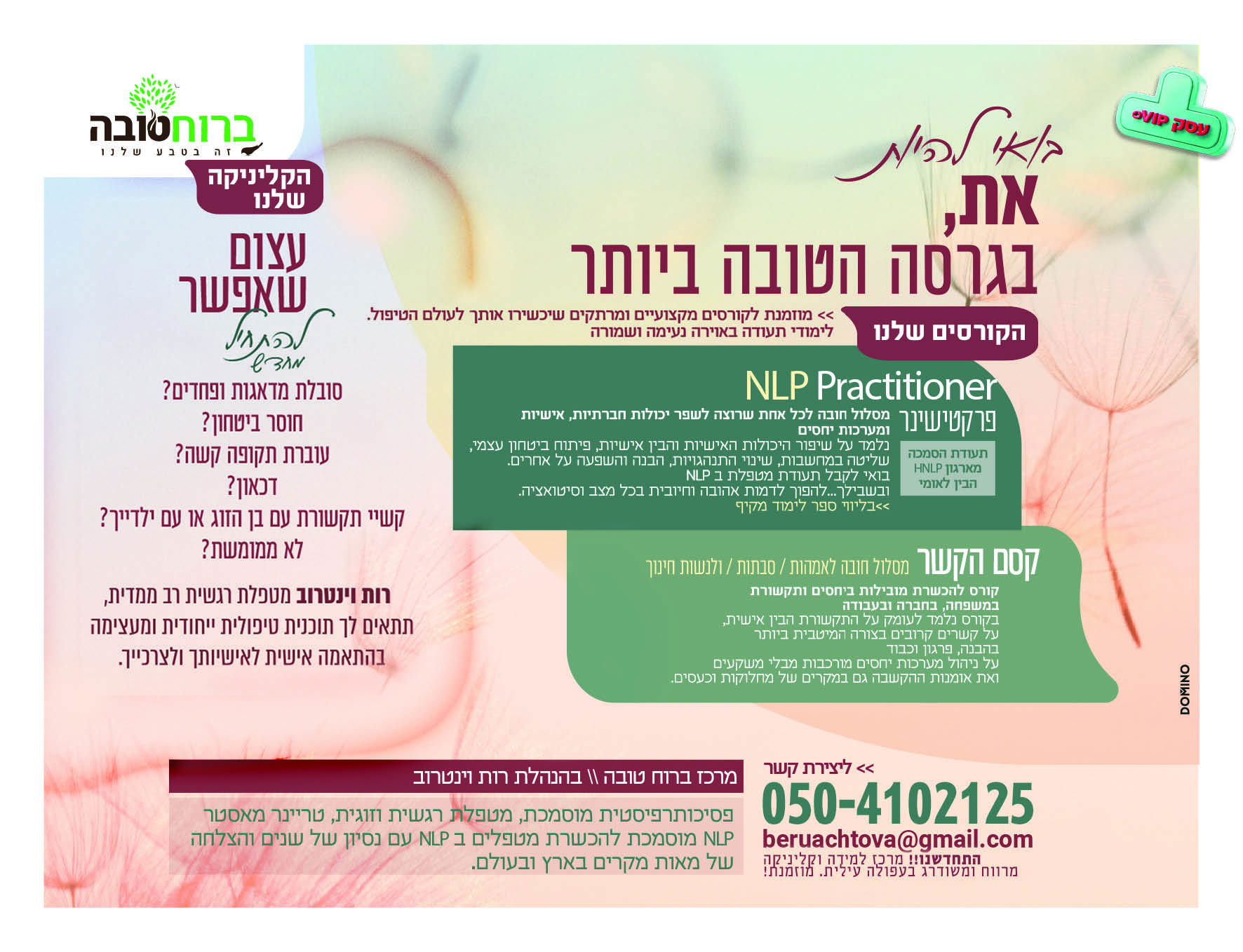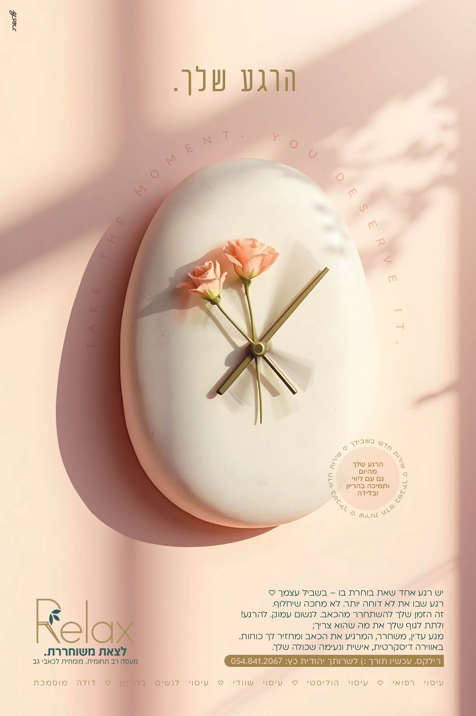 שם העסק: רילקס | שם בעלת העסק: יהודית כץ | תיאור העסק: קליניקה לעיסוי, רפלקסולוגיה וליווי לידה מקצועי. עיסוי רב תחומי, התמחות בכאבי גב, טיפולים לנשים בהריון וליווי לידה מקיף ומקצועי {החזרים מקופ"ח לזכאיות} | שעות פתיחה של העסק: בתיאום |כתובת העסק: חיננית ע. עילית | טלפון העסק: 054-8412067 | מייל: Y8412067@gmail.com