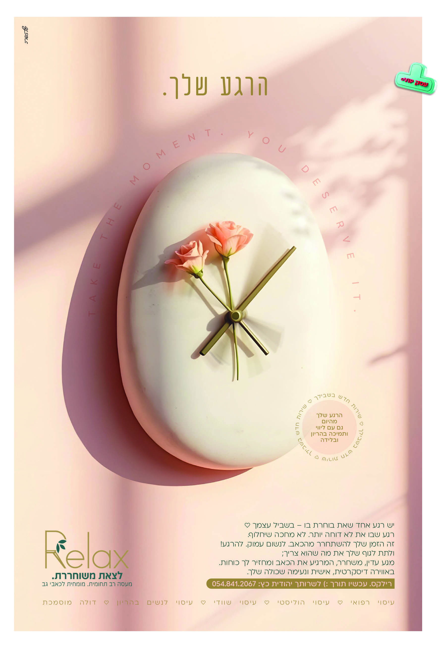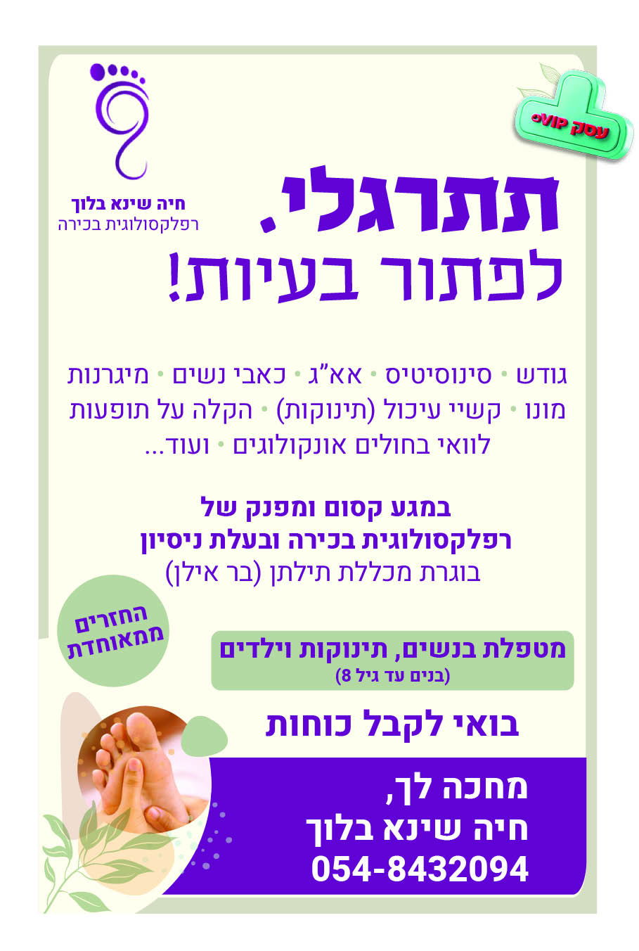 להתרשמות מהאתר שלי היכנס/י כאן!שם העסק: רילקס | שם בעלת העסק: יהודית כץ | תיאור העסק: קליניקה לעיסוי, רפלקסולוגיה וליווי לידה מקצועי. עיסוי רב תחומי, התמחות בכאבי גב, טיפולים לנשים בהריון וליווי לידה מקיף ומקצועי {החזרים מקופ"ח לזכאיות} | שעות פתיחה של העסק: בתיאום |כתובת העסק: חיננית ע. עילית | טלפון העסק: 054-8412067 | מייל: Y8412067@gmail.com