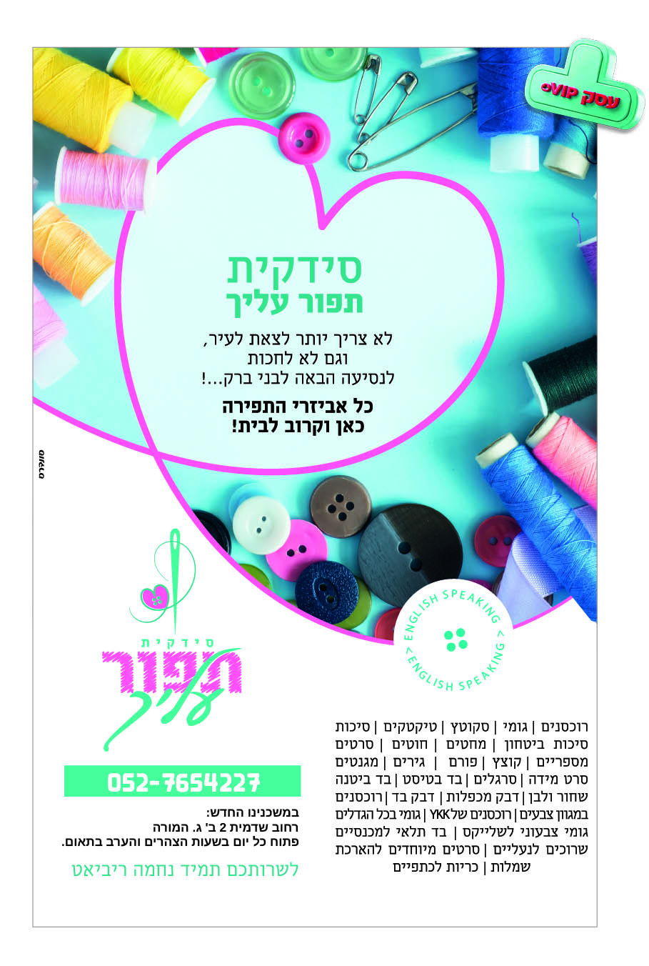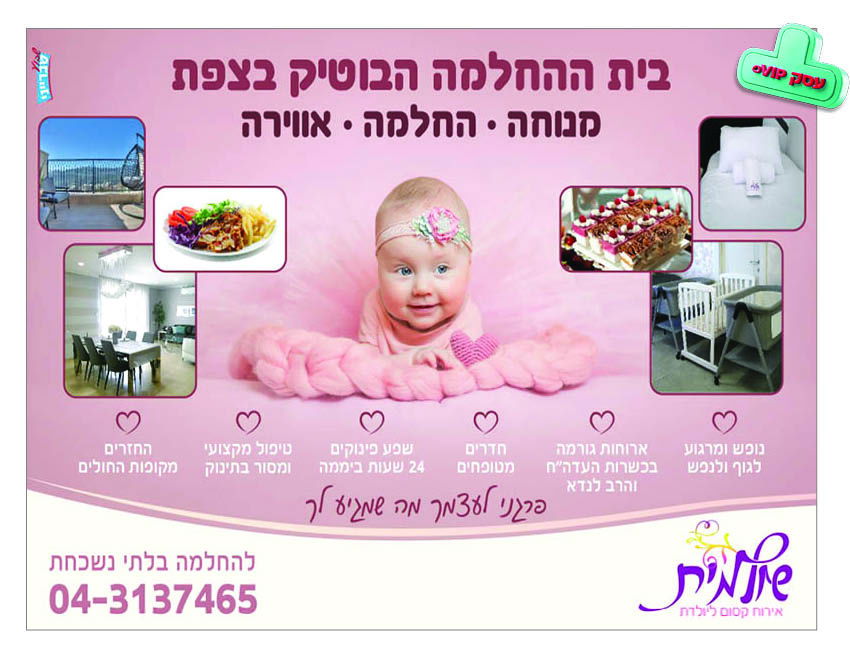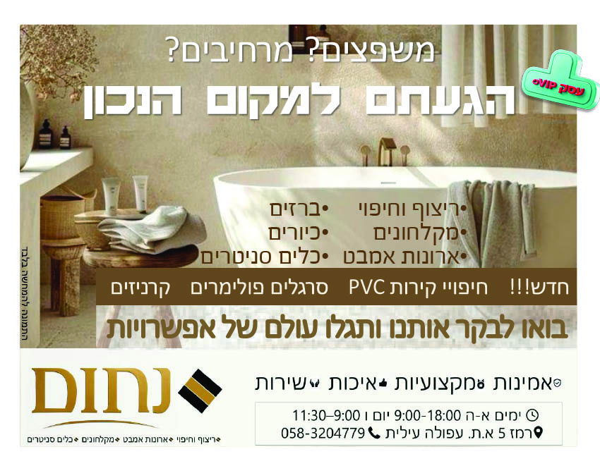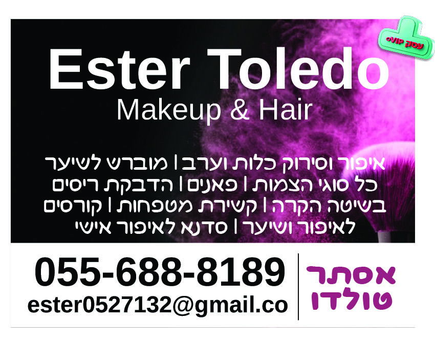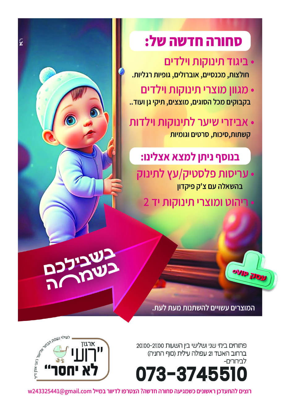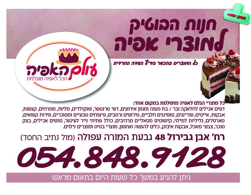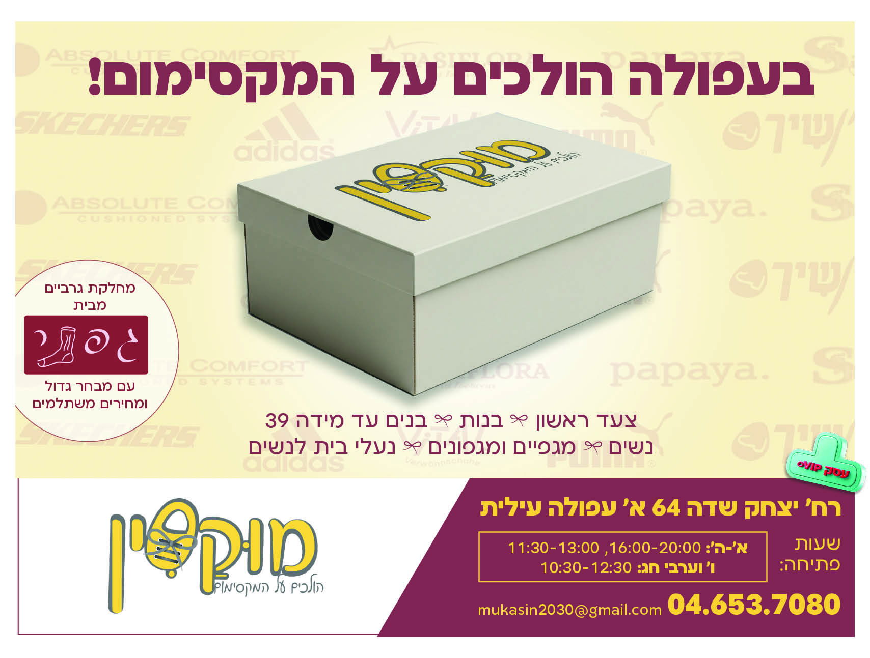 בלקין, ימים א'-ג' בתאום, ניתן לבוא עם ילדים, הבריגדה העברית 9 ג. המורה, 054-8474008 | אלאלוף, עגור 4 ג. המורה, 053-3178161 | ביגוד והנעלה יד 2 כחדש לכל המשפחה, משמר הירדן 14 עפולה, 058-3210103 | פרחי, הזמנת קומביזונים במבחר דגמים וצבעים לכל המצבים וכן גם בדגם חולצת בסיס כשרה, 054-8453017