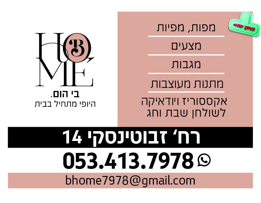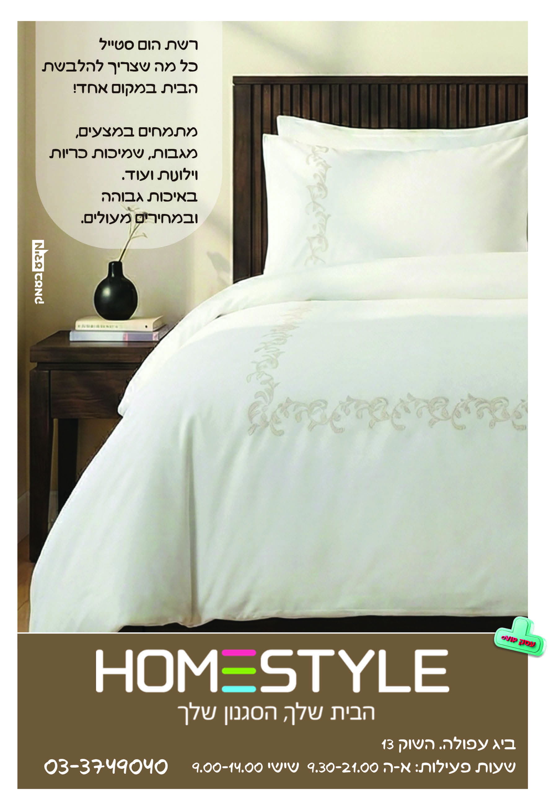 שם העסק: הום סטייל | תיאור העסק: הום סטייל: הלבשת הבית | שעות פעילות: א'-ה': 9:30-21:00 | ו': 9:00-14:00 |כתובת: השוק 13 ביג עפולה | טלפון: 03-3749040 | מייל: homestyles@extraretail.co.il