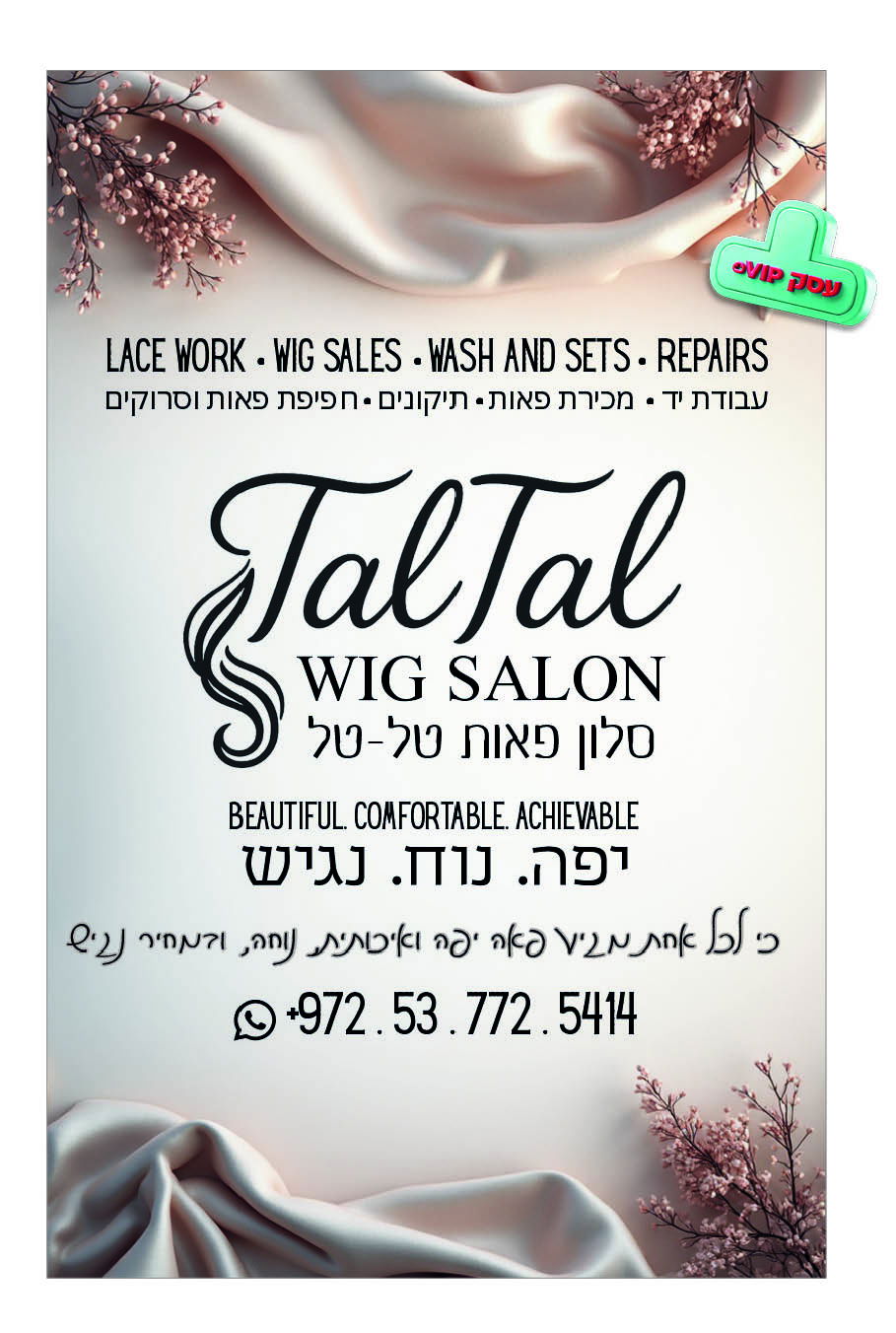 להתרשמות מהאתר שלי היכנס/י כאן!שם העסק: טליה גרוס, Talya Gross - טל-טל ספא שיער ופאות-Tal-Tal Hair Spa | תיאור העסק: סלון שיער בוטיק לכל צרכי השיער ופאה. תיקוני פאות, תספורות, חפיפה וסירוק. ניתן להשיג אצלינו גם סרט נגד החלקה לכיסויי ראש ופאות | שעות פעילות: ימים א'-ה' 9:00-15:00 / 20:00-22:00 | כתובת: רבי נחמן מברסלב 3, ע"ע | פלאפון: 053-7725414 | מייל: Taltalhairspa@gmail.com