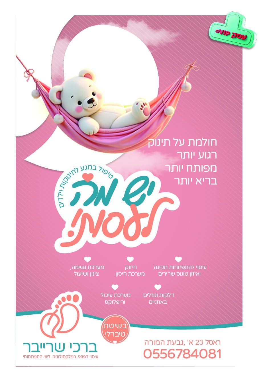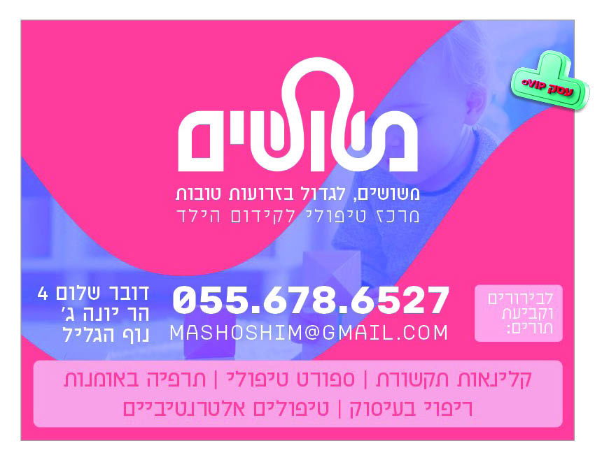 שם העסק: משושים| תיאור העסק: מרכז טיפולי לקידום הילד | שעות פעילות: בתיאום מראש - קביעת תורים בין השעות 10:00-12:30| כתובת: דובר שלום 4 דירה 15 נוף הגליל | פלאפון: 055-6786527 | מייל: mashoshim@gmail.com