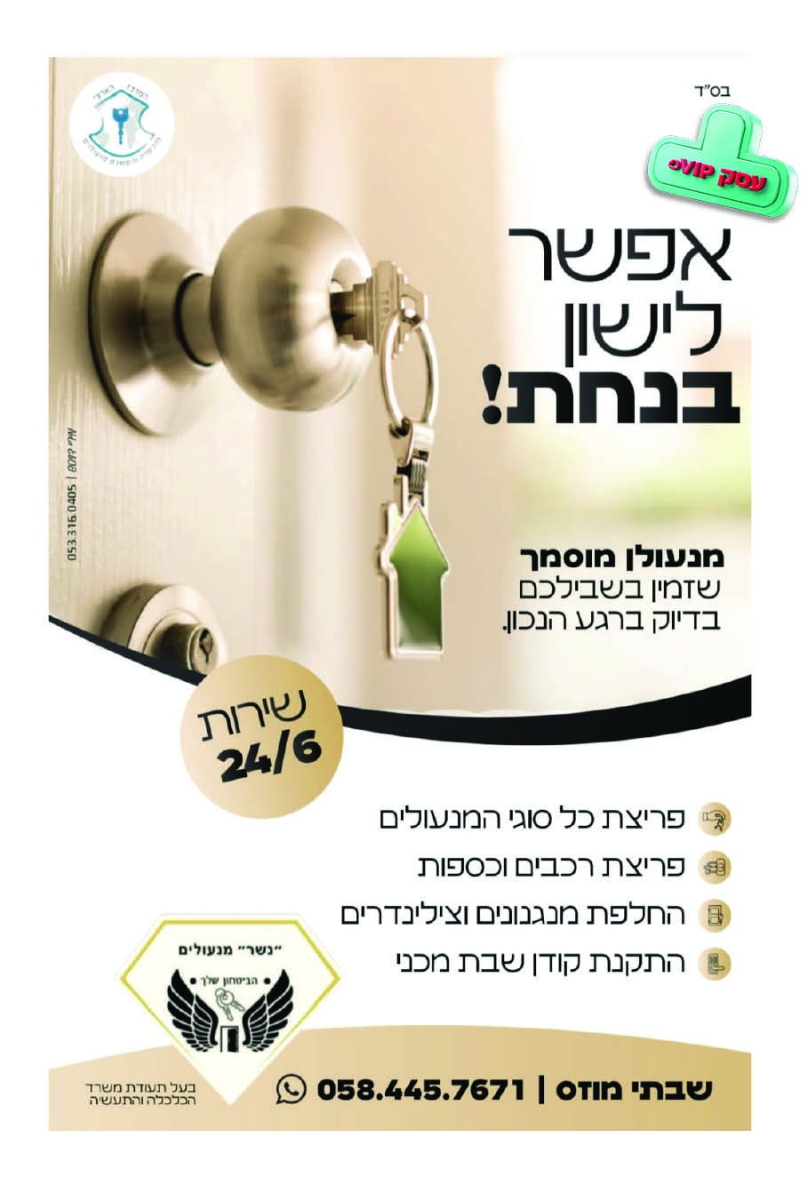 להתרשמות מהאתר שלי היכנס/י כאן!שם העסק: נשר מנעולים | תיאור העסק: מנעולן מורשה בפיקוח משרד הכלכלה, מתמחה בפריצת דלתות ורכבים, החלפת צילינדרים ומנגנוני אבטחה, ואספקת מנעולי e-lock חכמים לכל סוגי הדלתות | שעות פעילות: 24/6 | כתובת: יצחק שמיר 36 ע. עילית | פלאפון: 058-4457671 | מייל: Sbti.mozes148@gmail.com