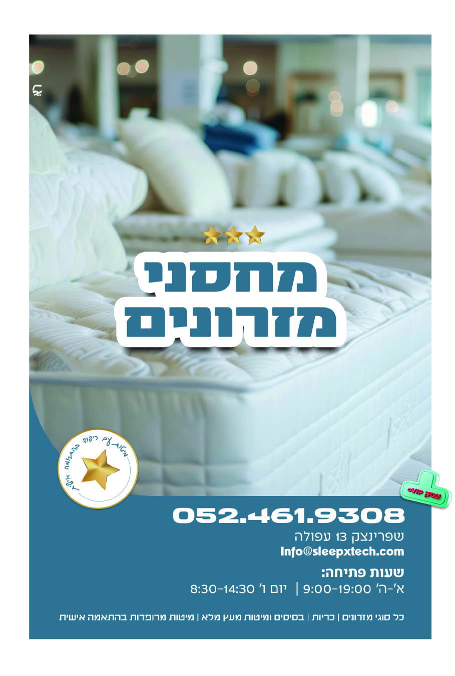 מאיר, 2 מזרונים, ה. סולד ג. המורה, 053-3141598 | פרוור, מזרונים לבין הזמנים בתשלום סמלי (5 ש"ח למזרון ללילה), נורית 19 נוף יזרעאל ג. המורה, 052-7110601 | שרעבי, צ'ק פיקדון, לתקופות קצרות - 5 ש"ח לשימוש ח"פ למספר מזרונים לא מוגבל, הרצוג 12 א' ג. המורה, 050-4198000 | קרץ, י. קורצ'ק 3 ב' ג. המורה, 054-6212770 | ערוסי, לתאם מראש, הברוש 23 ע. עילית, 052-7655271
