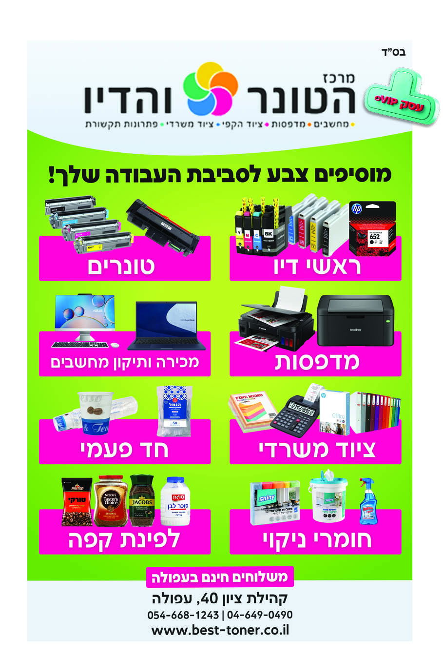להתרשמות מהאתר שלי היכנס/י כאן!שם העסק: מרכז הטונר והדיו | תיאור העסק: מחשבים, מדפסות, טונרים, ציוד משרדי - שירות טכנאי | שעות פעילות: 9:30-18:00 | כתובת: קהילת ציון 40 עפולה | פלאפון: 04-6490490 | מייל: best.toner@gmail.com