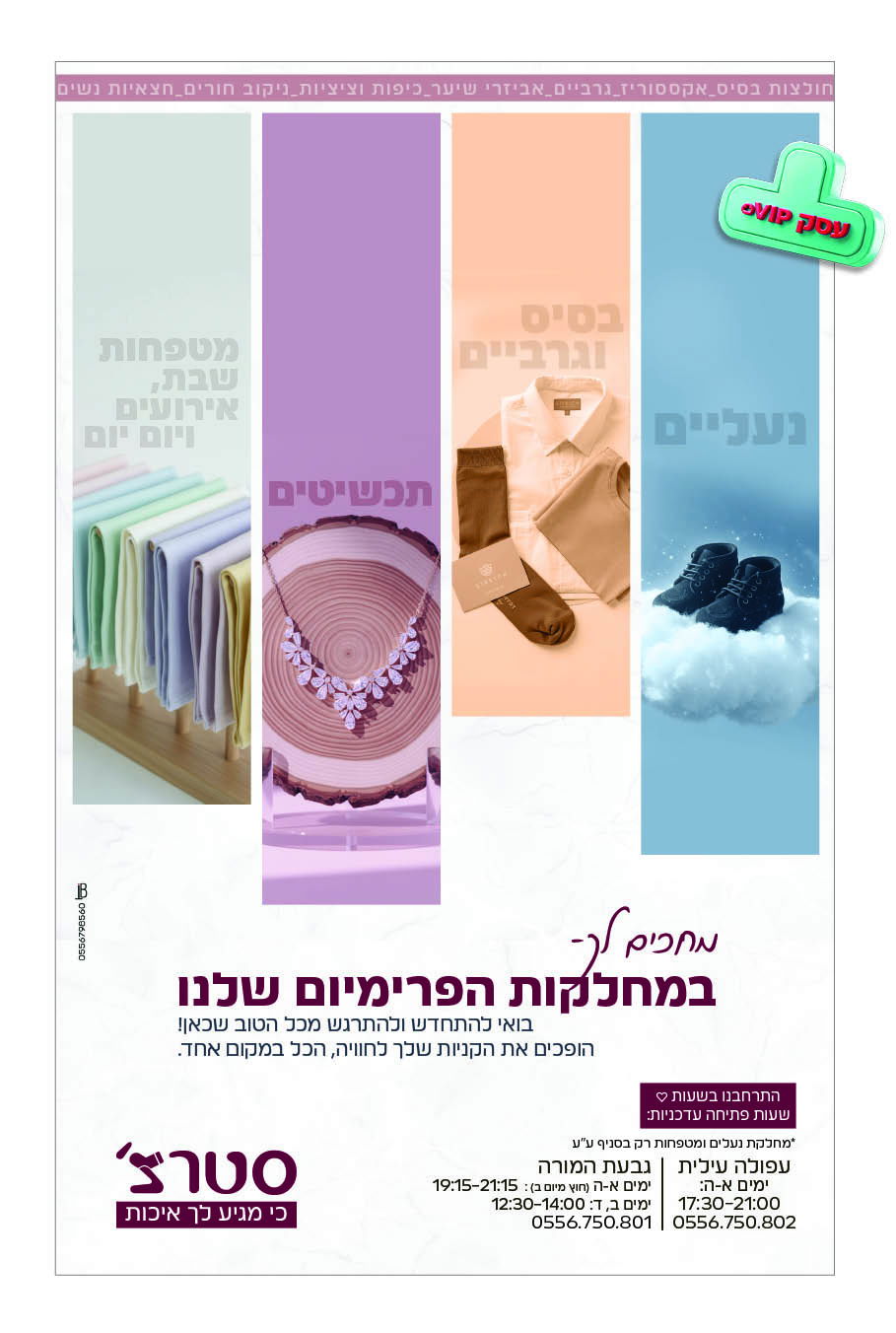 להתרשמות מהאתר שלי היכנס/י כאן!שם העסק: סטרצ' | תיאור העסק: ביגוד והנעלה, גרביים, חולצות בסיס, מטפחות, כיפות וציציות | שעות פעילות: סניף ג. המורה - ימים א' ג' ד' ה': 19:15-21:15, ימים ב' ד': 12:30-14:00 | סניף ע. עילית - ימים א'-ה': 17:30-21:00 |כתובת: סניף ג. המורה: רח' הנרייטה סולד 5 (מרכז מסחרי ליד קופ"ח מאוחדת) | סניף ע. עילית: רח' יצחק שדה 44/1 פלאפון: סניף ג. המורה: 055-6750801, סניף ע. עילית: 055-6750802, קו החנות-כללי: 04-6753718