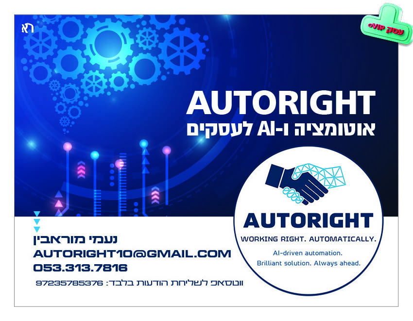 שם העסק: autoright | תיאור העסק: אוטומציה עסקית ותהליכים מבוססי AI |שעות פתיחה: 08:30 - 13:30 ובשעות הערב 20:00-22:00 | כתובת: הזהבן 14 ב' עפולה | פלאפון: 053-3137816 | מייל: n0533137816@gmail.com