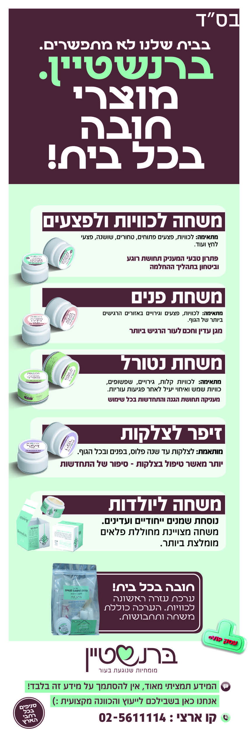 להתרשמות מהאתר שלי היכנס/י כאן!שם העסק: ברנשטיין חידוש העור | תיאור העסק: משחות טבעיות לריפוי בעיות עור - כוויות, פצעים צלקות ועוד. משחה מיוחדת ליולדת | שעות פעילות: בתאום מול מוקדי המכירה כתובת: מספר סניפים בעפולה, נוף הגליל ומגדל העמק | פלאפון: 052-7177342 (כהן, עפולה) | מייל: