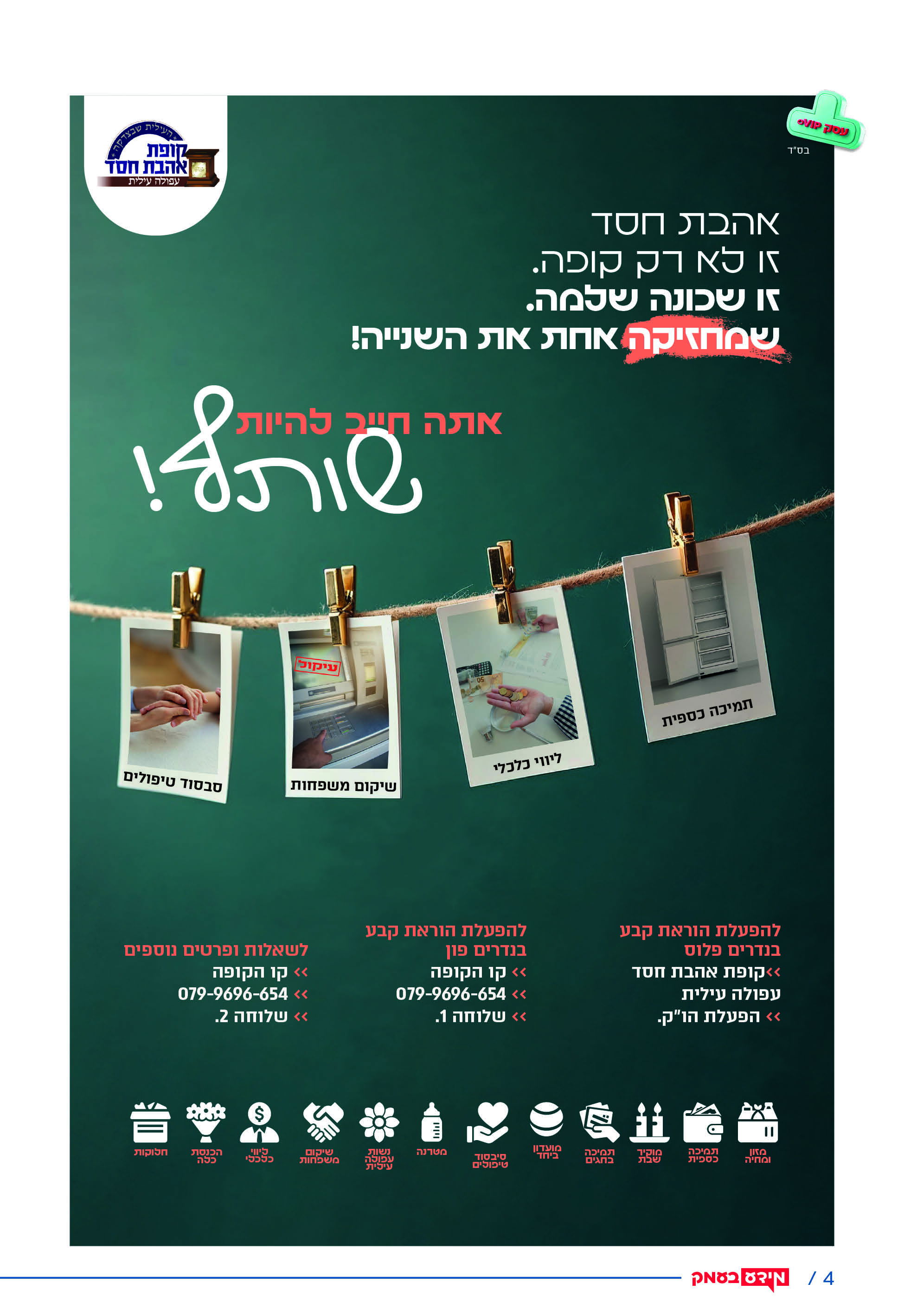 מכירת חסד שכונתית, הזמנות חמישי-ראשון, בטלפון/באתר, איסוף- יום שלישי, להזמנות: 077-3168080, לשירות לקוחות: 08-9798574 | עפולה - גבעת המורה 1, אבן גבירול 12, אחראי התחנה: מש' פוקסברומר (בשעות הפעילות בלבד), שעות הפעילות 18:30-19:20 | עפולה - גבעת המורה 2, ה. סאלד 1 (מאחורי קופ"ח מאוחדת), אחראי התחנה: מש' בוקובזה, שעות הפעילות: ימי שלישי, נשים:18:30-19:00, גברים: 19:00-19:30 | עפולה - גבעת המורה 3, עלית הנוער 3 ברחבה, אחראי התחנה מש' קלר, שעות הפעילות: 18:30-19:30 | עפולה עילית 1, חיננית 4 בחניה, אחראי התחנה מש' שרייבר, שעות הפעילות: יום ג', נשים: 17:30-18:30, גברים: 18:45-19:30 | ע. עילית 2, הרצל 16, אחראי התחנה: מש' כץ, | ע. עילית 3, הרב קוק 53, אחראי התחנה: מש' יונגר, שעות הפעילות: ימי שלישי 19:50-20:10