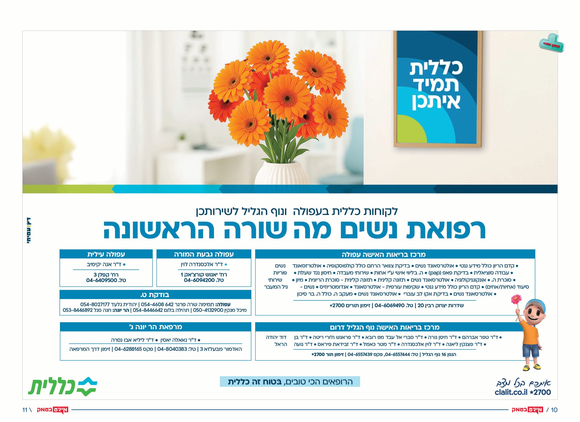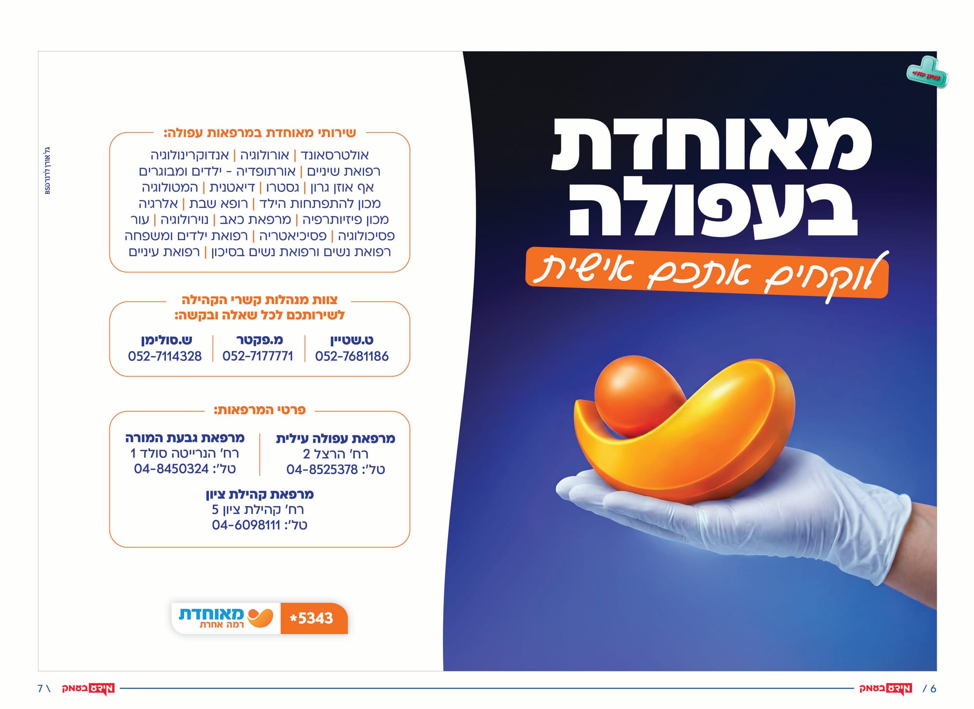 הקישון 15 עפולה, שעות פעילות: א'-ה': 09:00-12:00, א' ב' ג' ה': 16:00-18:00, ו': 09:00-11:00, טלפון: 04-6404747 | שדרות יצחק רבין 21, בי"ח העמק, שעות פעילות: א'-ה' 10:00-13:30, ו': 10:00-12:00, טלפון: 04-6403088 | גולן 120 נוף הגליל, שעות פעילות: א'-ה': 09:00-11:45, א' ד': 16:00-17:45, ו': 09:00-11:00, טלפון: 04-6552263